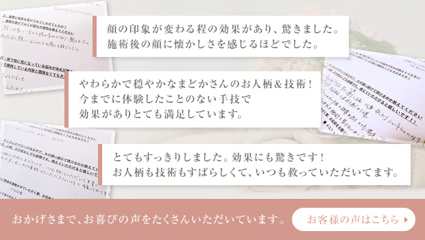 ある程度回数を重ねていただくと、1か月以上気分があがるお顔が維持できるようになります。